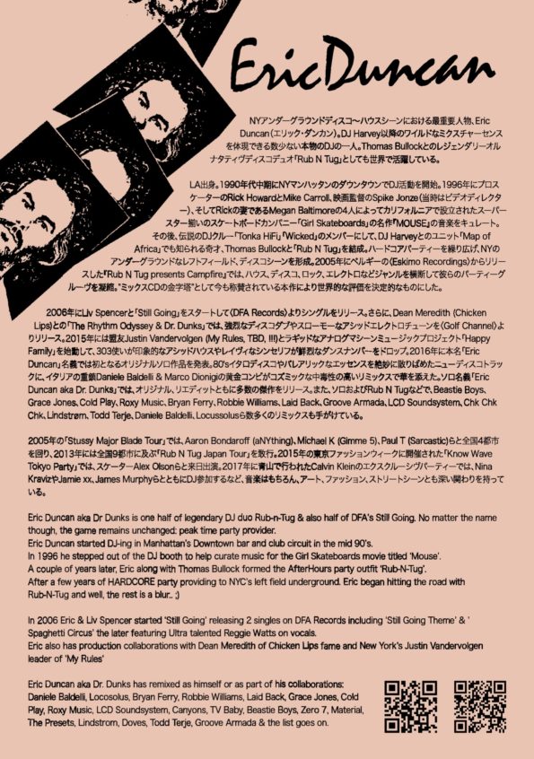NYアンダーグラウンドディスコ〜ハウスシーンにおける最重要人物、Eric Duncan(エリック・ダンカン)。DJ Harvey以降のワイルドなミクスチャーセンスを体現できる数少ない本物のDJの一人。Thomas Bullockとのレジェンダリーオルナタティヴディスコデュオ「Rub N Tug」としても世界で活躍している。