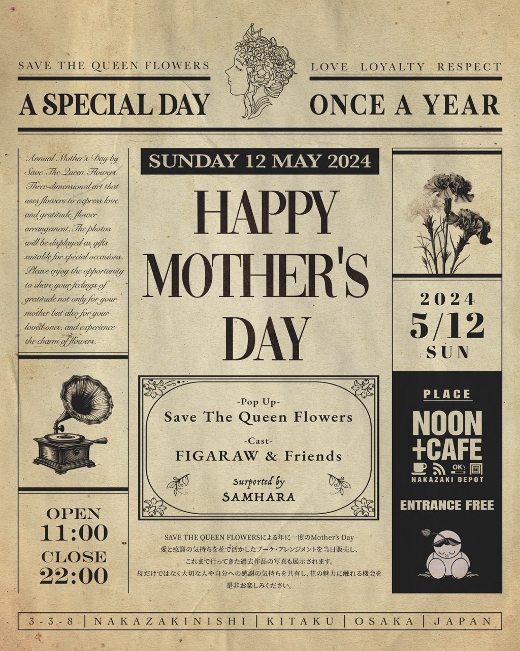 SAVE THE QUEEN FLOWERSによる年に一度のMother’s day 愛と感謝の気持ちを花で活かしたブーケとアレンジメントを当日販売し、これまで行ってきた過去作品の写真展示や絵画アーティストとのコラボレーション作品の展示も行います。