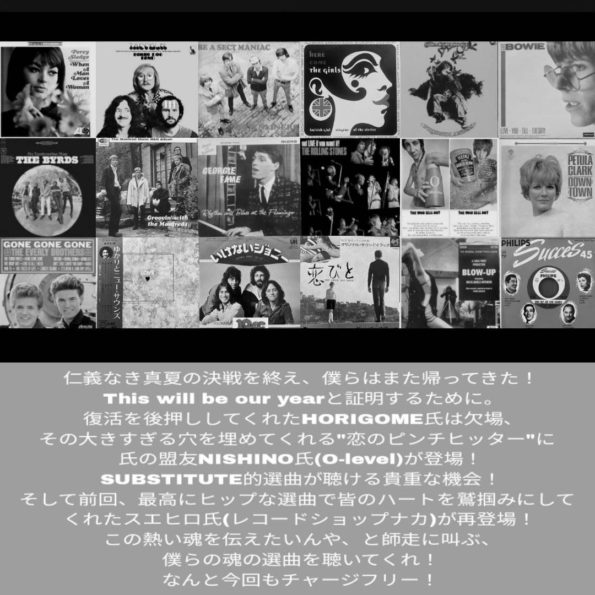 仁義なき真夏の決戦を終え、僕らはまた帰ってきた! THIS WILL BE OUR YEAR と証明する為に。復活を後押ししてくれたhorigome氏は欠場、その大き過ぎる穴を埋めてくれる”恋のピンチヒッター”に氏の盟友NISHINO(O-level)氏が登場!substitute的選曲が聴ける貴重な機会!
