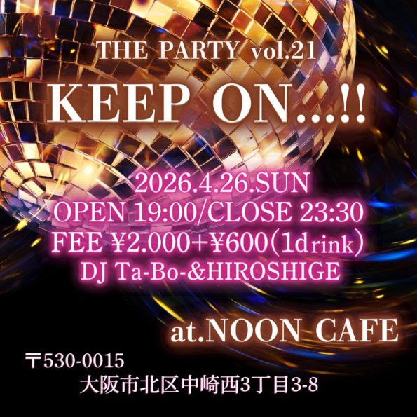 THE PARTY vol.21 KEEP ON..!!! 2026.4.26.SUN OPEN 19:00/CLOSE 23:30 FEE ¥2.000 + ¥600(1drink) DJ Ta-Bo-&HIR…