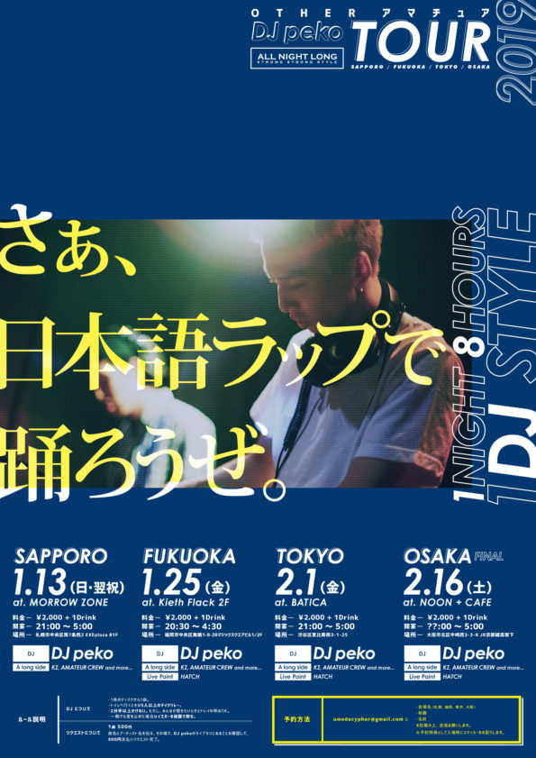 DJ peko TOUR 2019 "8hours JAPANESE HIPHOP SET" 日時:2月16日(土) 時間:19:00~5:00 料金:¥2,000-(別途1D) ■CAST: DJ:peko (10ho…