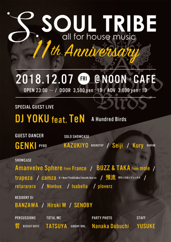 SOUL TRIBE 11th Anniversary 2017.12.7 (FRI) at NOON+cafe 料金:DOOR 3,500(1D) *ADV 3,000(1D) 時間:23:00~ DJ YOKU fe…