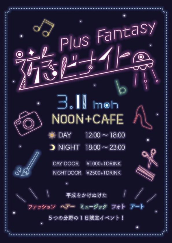 遊ビナイト+fantasy noon+cafe 3月11日 day12;00~ ¥1000+Drink night18;00~23;00 ¥2500+Drink ヘアー、ファッション、音楽、アート、フォト 様々な分野をリ…