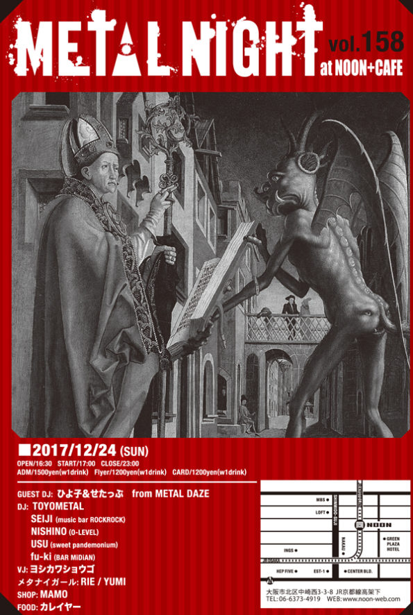 「METAL NIGHT -vol.158-」 @NOON 2017.12.24.sun OPEN:16:30 START:17:00‾23:00 CHARGE:1500yen(1DRINK) *フライヤーorメタルナイ…