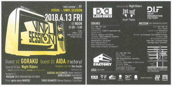 "VINYL SESSION" Vol. 91 - VISUAL & VINYL SESSION - 2018.4.13 FRI @NOON (大阪・梅田) 21:00 - 5:00 Charge: 1500ye…