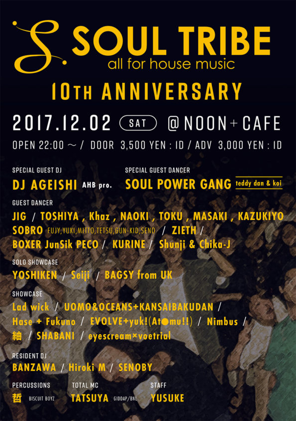 SOUL TRIBE 10th Anniversary 2017.12.2 (SAT) at NOON+cafe 料金:DOOR 3,500(1D) *ADV 3,000(1D) 時間:22:00~ ■SPECIAL G…