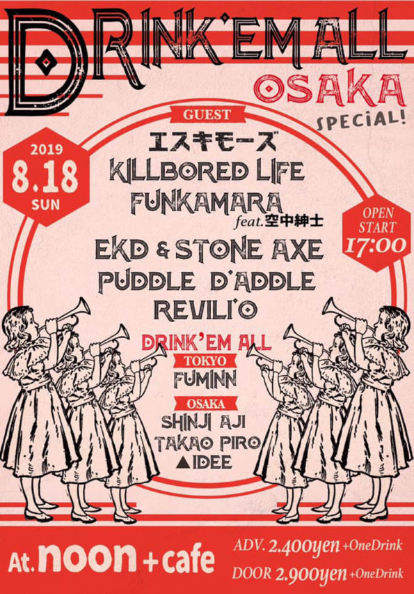 DRINK 'EM ALL OSAKA SPECIAL 2019.8.18(Sun.) START 18:00 TICKETS: ADV ¥2,400- / DOOR ¥2,900- (+1D) AT NOON+CAFE…
