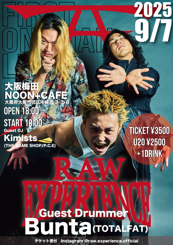 2025/9/7 sun 『RAW EXPERIENCE 』 OPEN 18:00 START 19:00 【LIVE】 RAW EXPERIENCE Guest Drummer Bunta(TOTALFAT) 【GUE…