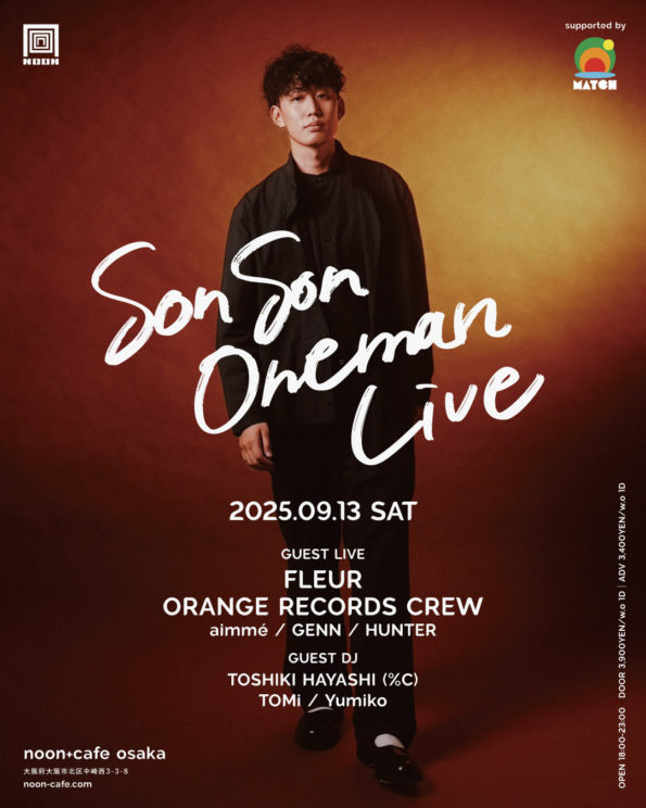 SonSon One-man LIVE Supported by MATCH 9/13(土) . 【OPEN】 18:00-23:00 . 【FEE】 DOOR ¥3,900円+1D別途 ADV ¥3,400円+1D別途…