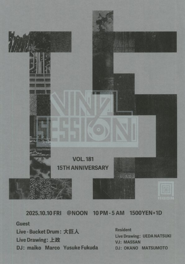 "VINYL SESSION" VOL. 181 15TH ANNIVERSARY 2025.10.10 FRI at NOON 22:00 - 5:00 1500YEN + 1D ◆ Guest 大巨人 上政 maik…