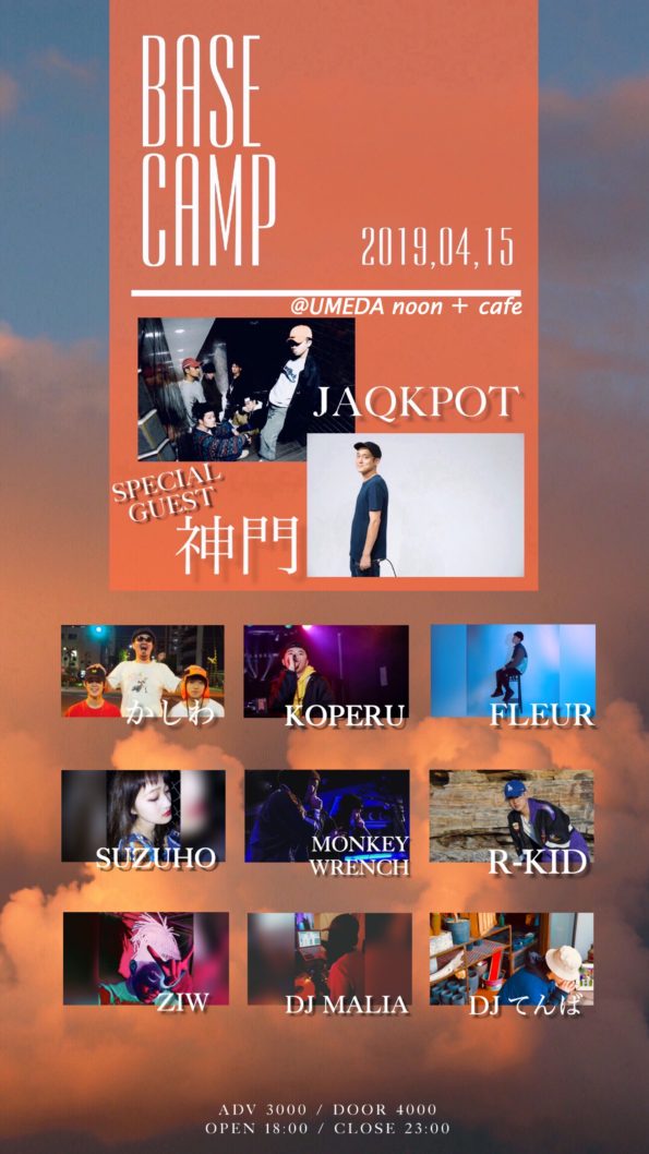 BASE CAMP VOL.2 at. UMEDA NOON+CAFE 2019.04.15(月) OPEN/CLOSE 18:00/23:00 ADV. ¥3,000+1D DOOR. ¥4,000+1D ■SPECI…