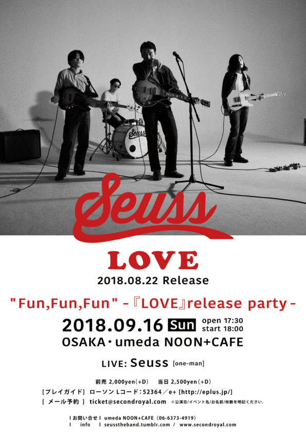 Seuss presents "Fun,Fun,Fun" -『LOVE』 release party - 2018.09.16(日) 会場:大阪・梅田NOON+CAFE LIVE:Seuss ※ワンマン Open 17:…