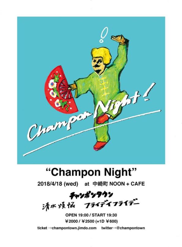 Champon Night 2018年4月18日 Open 19:00 Start 19:30 ■ticket 前売¥2000(別途1ドリンク) / 当日¥2500(別途1ドリンク) ■出演 チャンポンタウン 清水煩悩 …