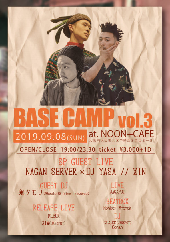 BASE CAMP vol.3 at. NOON+CAFE 2019.09.08(日) OPEN/CLOSE 19:00/23:30 ticket ¥3,000+1D ■SP GUEST LIVE: NAGAN SERV…