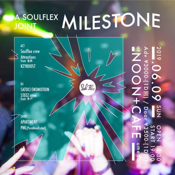 Soulflex presents MILESTONE 日程: 6/9 (sun) 場所: 大阪梅田noon Open 18:30 start 19:00 ■Act: Soulflex crew Attractions …