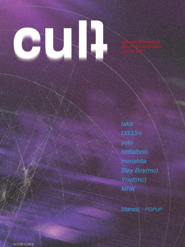 cult 8/30〔Sat.) 18:00-23:30 2500yen dj taka t3333rv kyrlvc notfatboiii morishlta mrkcul pop up b…